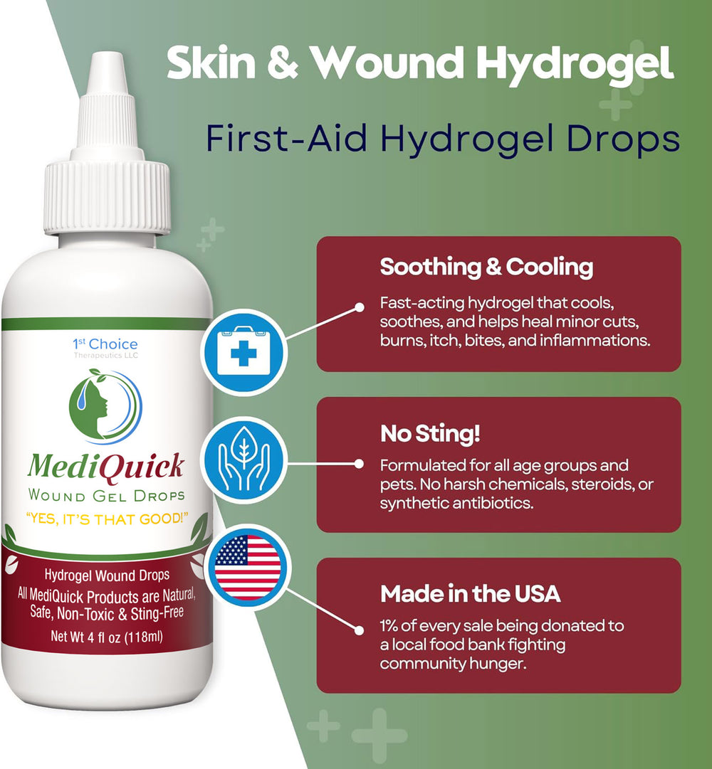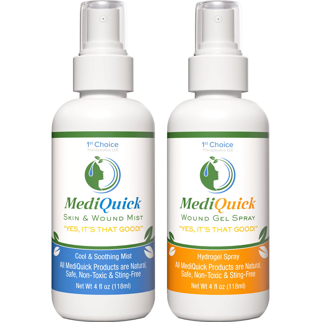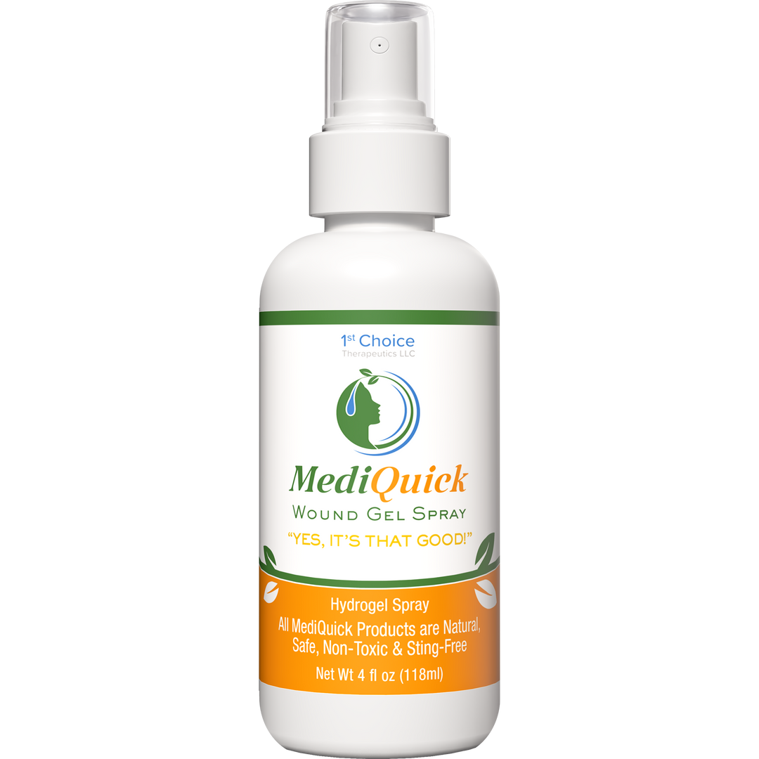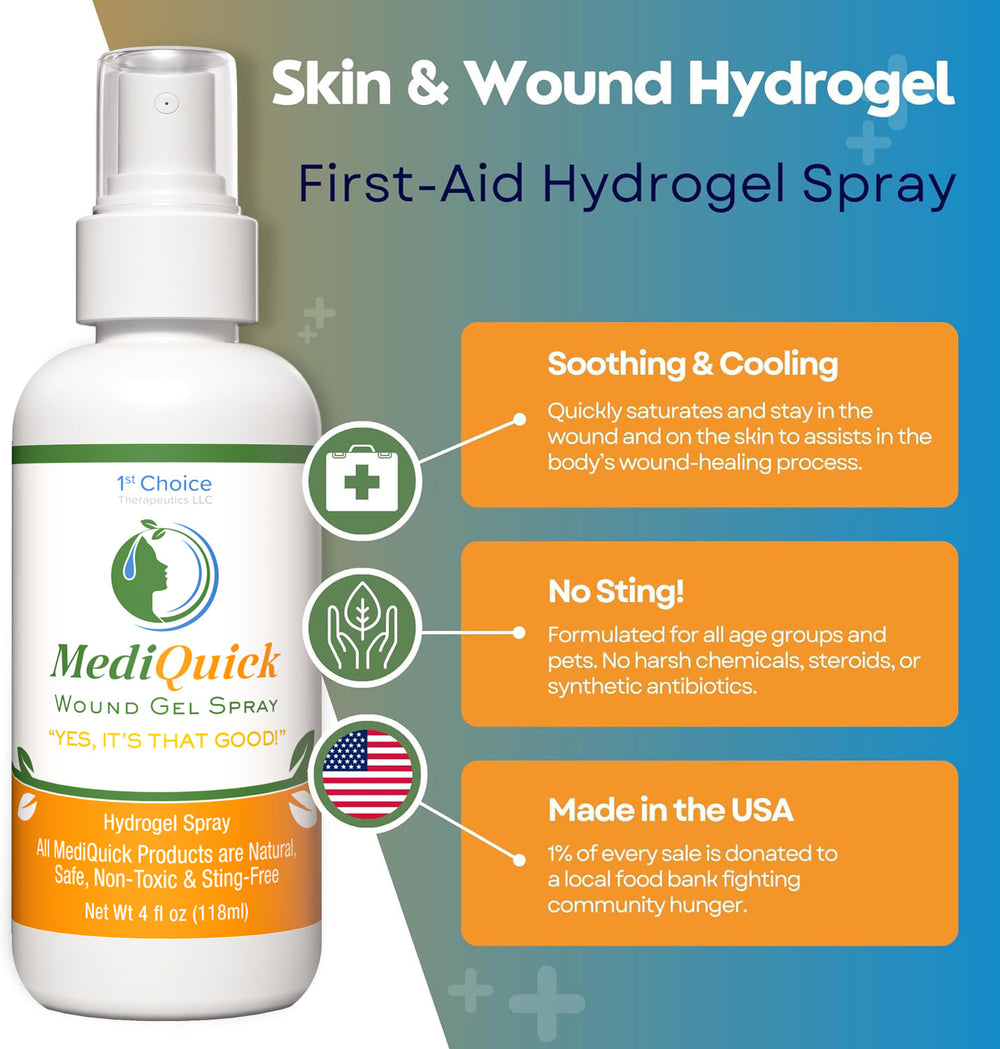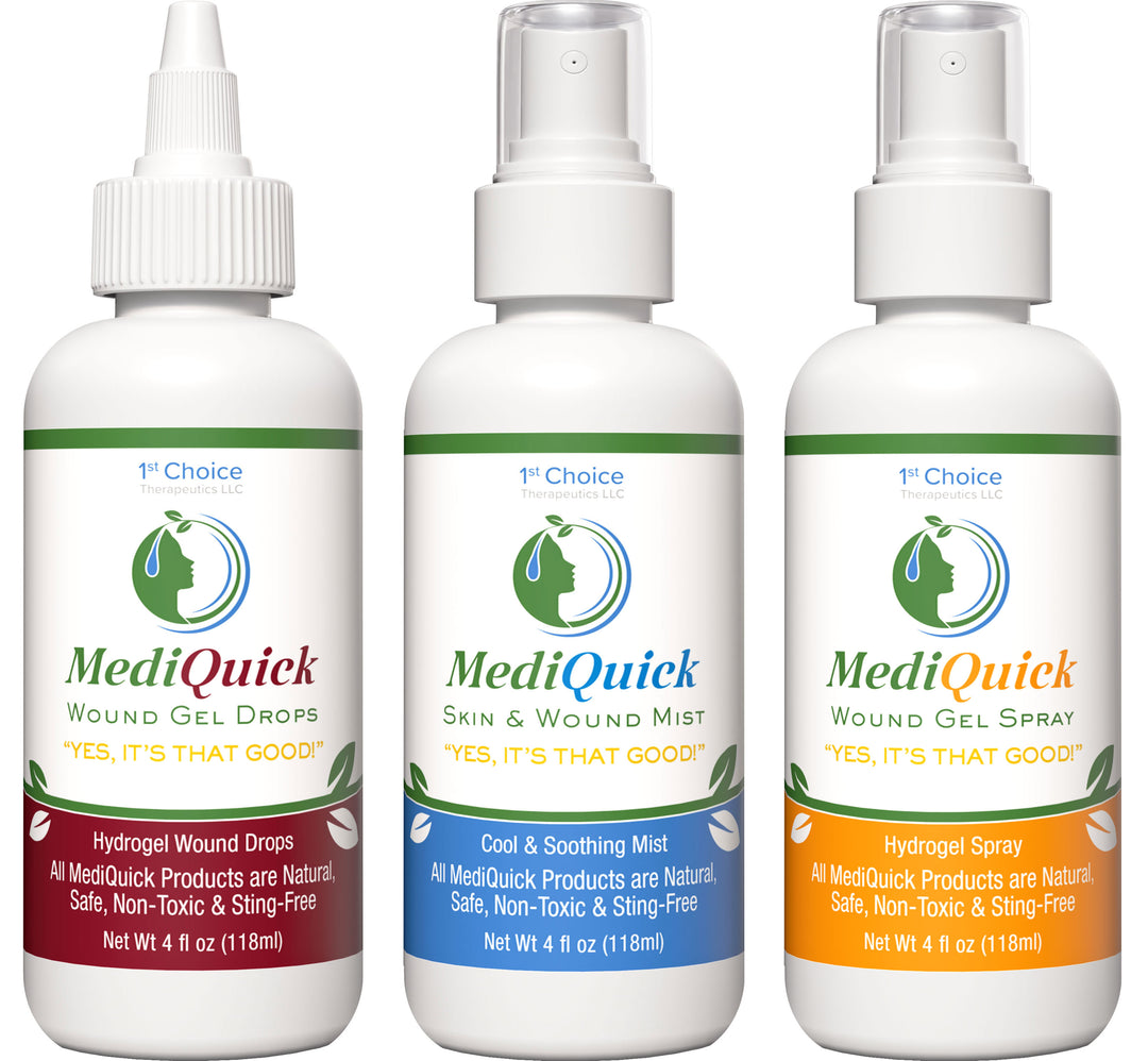 | FIRST AID USES: WOUNDS, CUTS, SCRAPES, SUNBURNS, SHAVING NICKS | 1st Choice | 1st Choice | 1st Choice | All MediQuick products contain Antibacterial HOCl. They have different applicators in two different formulations (Mist & Hydrogel) for Wound and Skin Repair. |