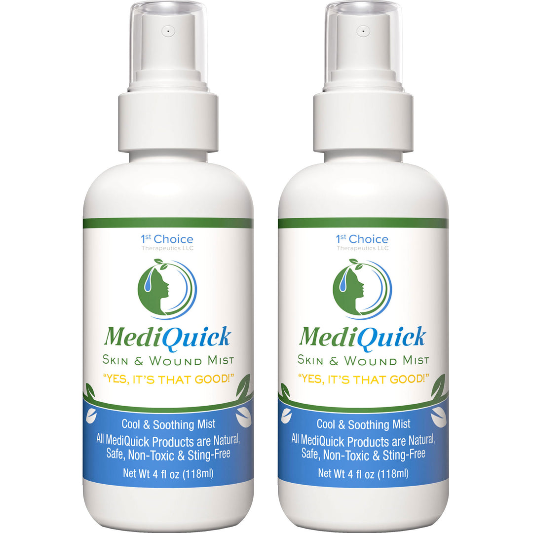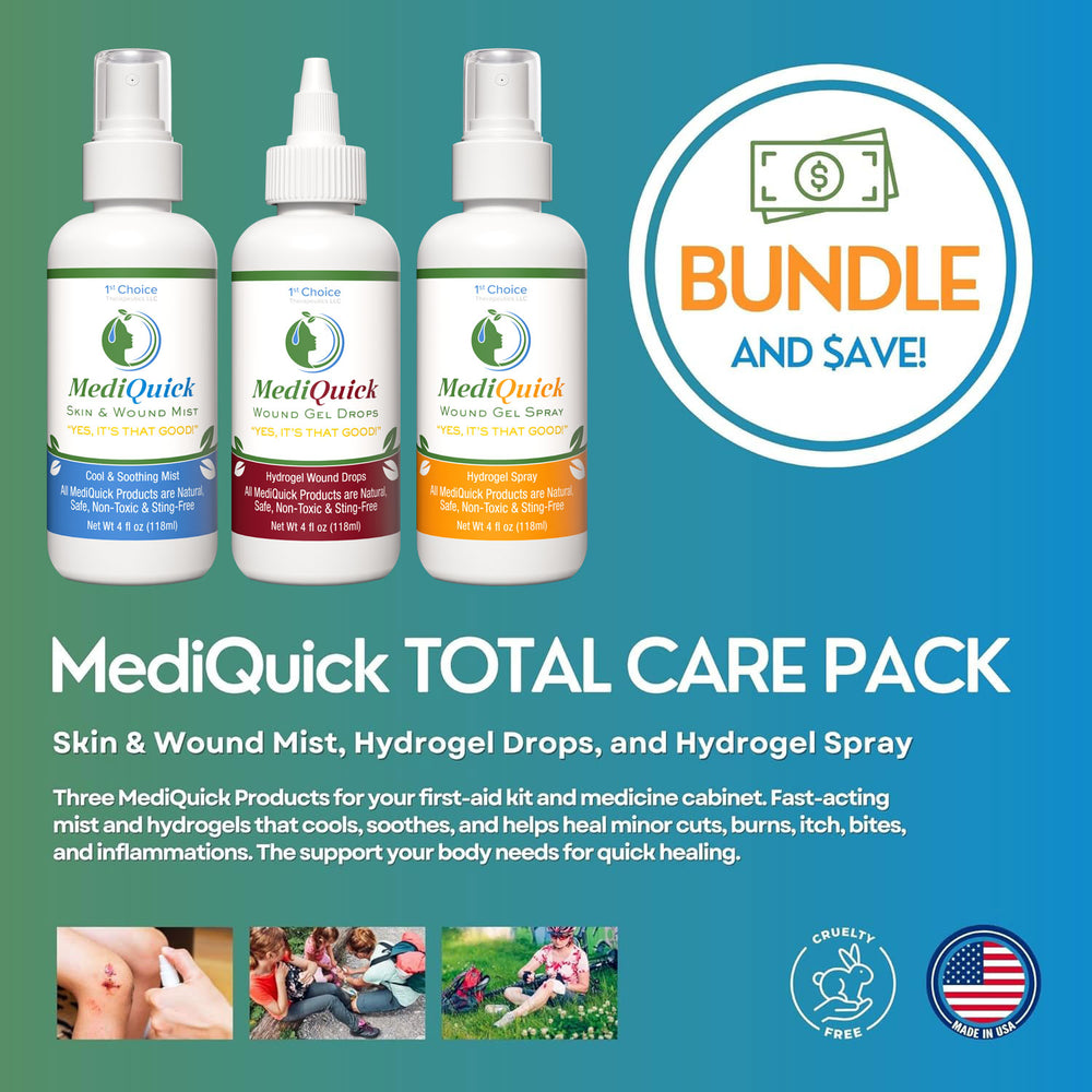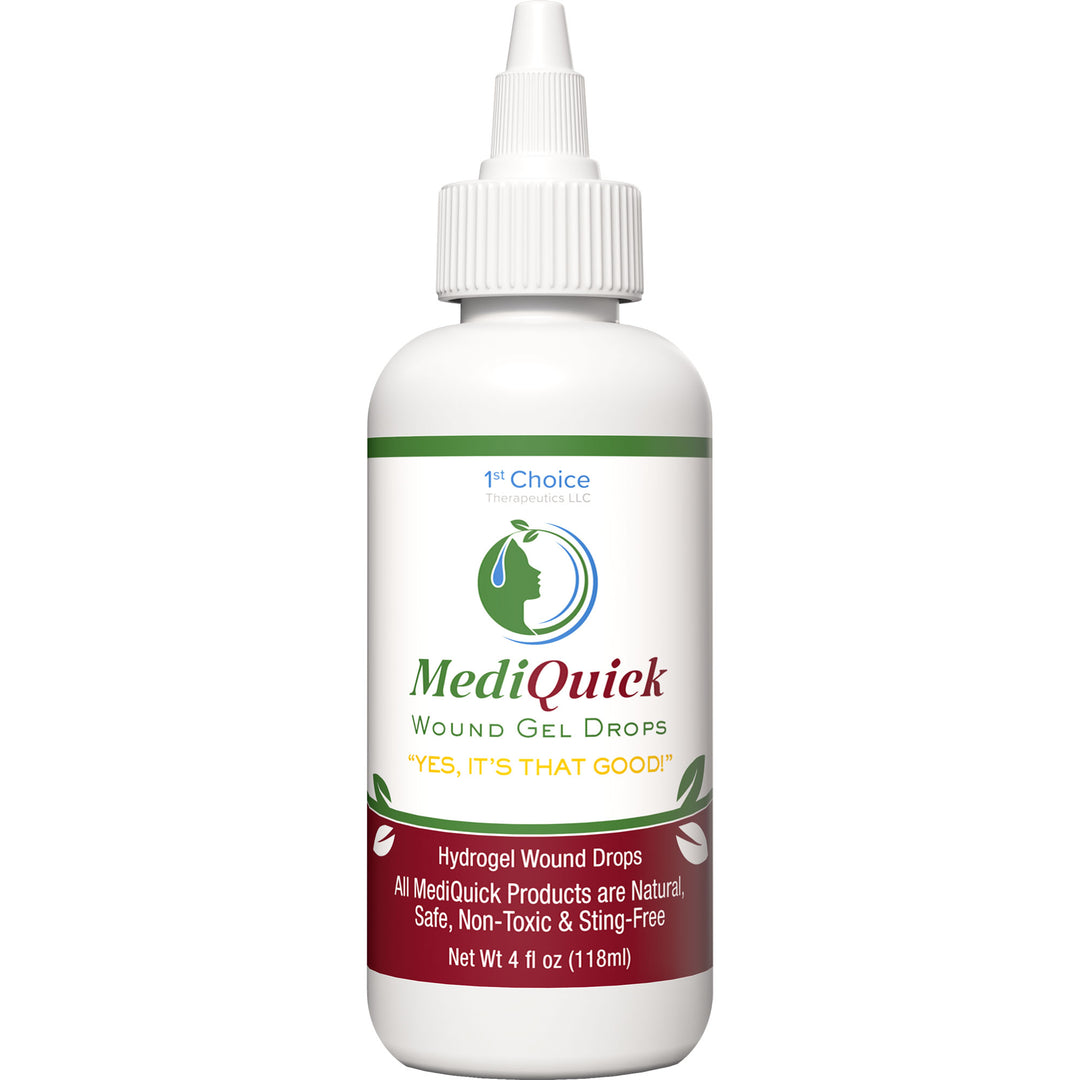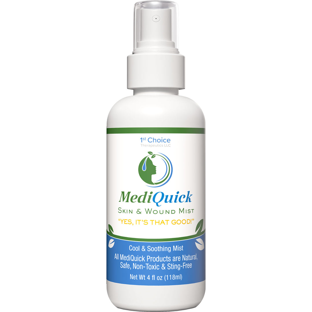| FIRST AID USES: WOUNDS, CUTS, SCRAPES, SUNBURNS, SHAVING NICKS | 1st Choice | 1st Choice | 1st Choice | All MediQuick products contain Antibacterial HOCl. They have different applicators in two different formulations (Mist & Hydrogel) for Wound and Skin Repair. |