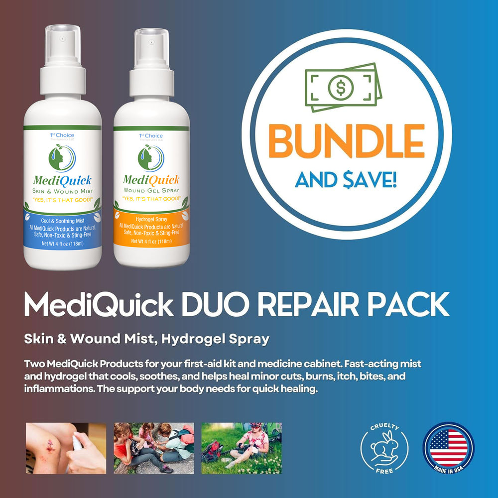 MediQuick offers a range of advanced first-aid solutions designed for effective and natural skin and wound care. The MediQuick Mist provides 12-hour action, quick relief, and healing for various skin issues like cuts, burns, rashes, and acne, in a no-sting formula safe for all ages and pets. The MediQuick Gel Spray features a thicker hydrogel that adheres well to larger areas, offering long-lasting support for sunburns, eczema, and inflamed skin while minimizing scarring. For precision application, the MediQuick Gel Drops are perfect for smaller spots, providing a mess-free, soothing solution that speeds healing and leaves skin smoother. All products are cruelty-free, vegan-friendly, and made in the USA, ensuring safe, high-quality care for your family and pets
